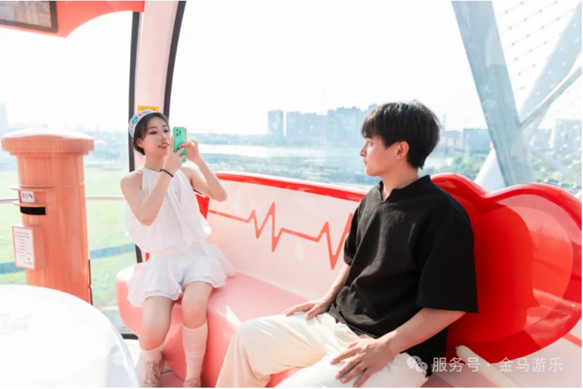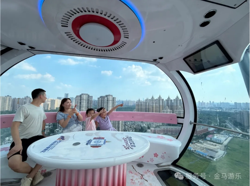轉(zhuǎn)輪配備36個(gè)面積國內(nèi)領(lǐng)先的的橢圓形全景“太空艙”轎廂,單艙面積約6平方米,可容納8-10人,滿載可乘坐352人。艙內(nèi)設(shè)有環(huán)形座椅及中央活動(dòng)區(qū),滿足全家同乘的寬敞舒適需求。獨(dú)特的吊掛式橢圓轎廂搭配360°全透明玻璃幕墻,營造無死角全景視野,游客可盡覽景區(qū)及壯闊長江風(fēng)光,仿佛置身云端,感受城市脈動(dòng)。艙內(nèi)更融合技術(shù)創(chuàng)新與美學(xué)設(shè)計(jì),打造了涵蓋極地、愛情、童趣等多種風(fēng)格的主題艙,以及驚險(xiǎn)刺激的底部透明艙,支持婚禮、慶生、商務(wù)派對(duì)等主題定制活動(dòng)。此外,艙內(nèi)還配備電子屏實(shí)時(shí)拍照、燈光氛圍調(diào)節(jié)等功能,滿足多元化場景需求。通過以上創(chuàng)新設(shè)計(jì),成功將“楚天之眼”從傳統(tǒng)的觀景設(shè)施升級(jí)為多功能社交空間,塑造了武漢文旅新地標(biāo)。