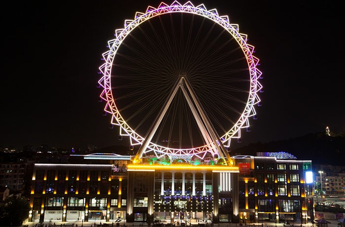 觀覽?是?套?于樓頂經(jīng)歷強(qiáng)臺(tái)?“天鴿”襲擊,仍“巋然不動(dòng)”,安全使?。塔架采?圓管?字?柱結(jié)構(gòu),轉(zhuǎn)盤(pán)為輻條式,吊廂懸掛在轉(zhuǎn)盤(pán)的外側(cè)?撐架上,造型獨(dú)特新穎,轉(zhuǎn)盤(pán)結(jié)構(gòu)通透。達(dá)到?點(diǎn)時(shí),距離地?的?度可達(dá)到108?,將乘客帶到?覽?遺的天空之上,俯視?圓10公?以?xún)?nèi)的景致。